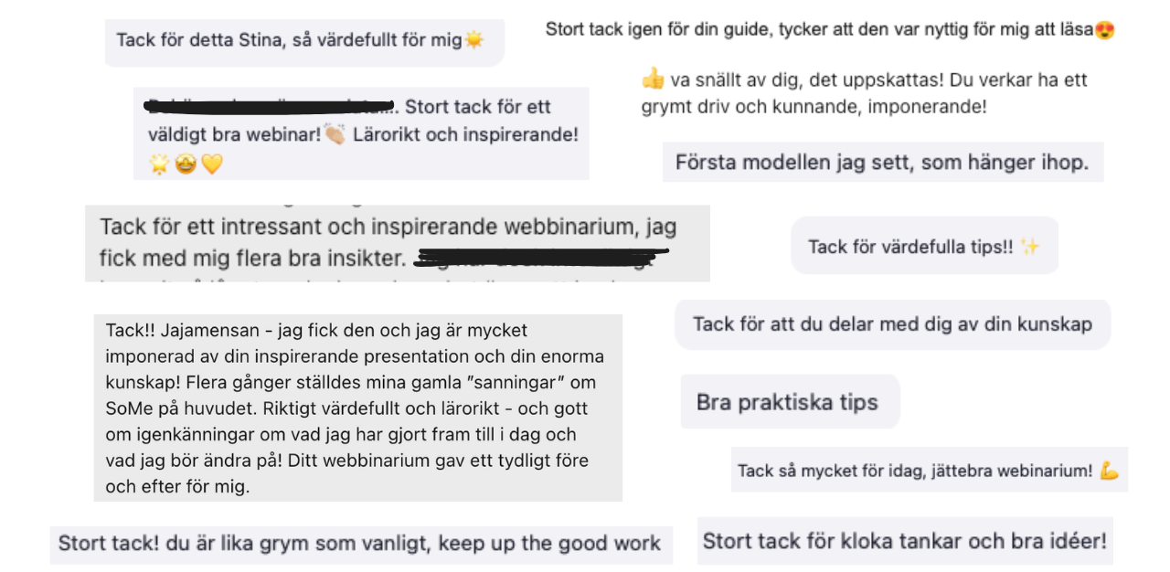 Det bästa med Stina är hennes proffsighet och lugn. Inget känns svårt eller omöjligt när man har henne vid sin sida. Jag fick verkligen svar på både stora och små frågor, och känner nu att jag kan hantera mina sociala kanaler på ett mycket mer avslappnat och självsäkert sätt – tack vare Stinas handfasta och kloka råd.